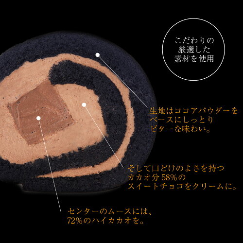 チョコ好きにはたまらない最高の贅沢をお届けします!クリーム・スポンジ・ムース・・・素材全てに最高の材料を吟味し技を駆使した、こだわりのショコラロールです。